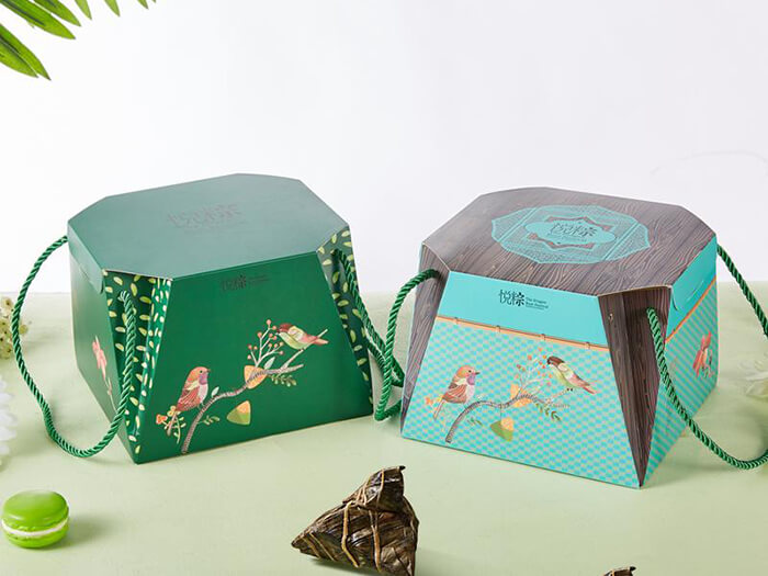对于粽子包装盒的美观性,除了在包装盒中添加节日元素外,还可以通过结构设计来完成。比如,根据粽子的形状来设计不倒翁形状、金字塔形状的结构;又或者将传统的矩形包装盒结构改成多边形结构等等。这些都是可以提高包装盒美观性以及独特性的最佳方式,以吸引用户的关注。