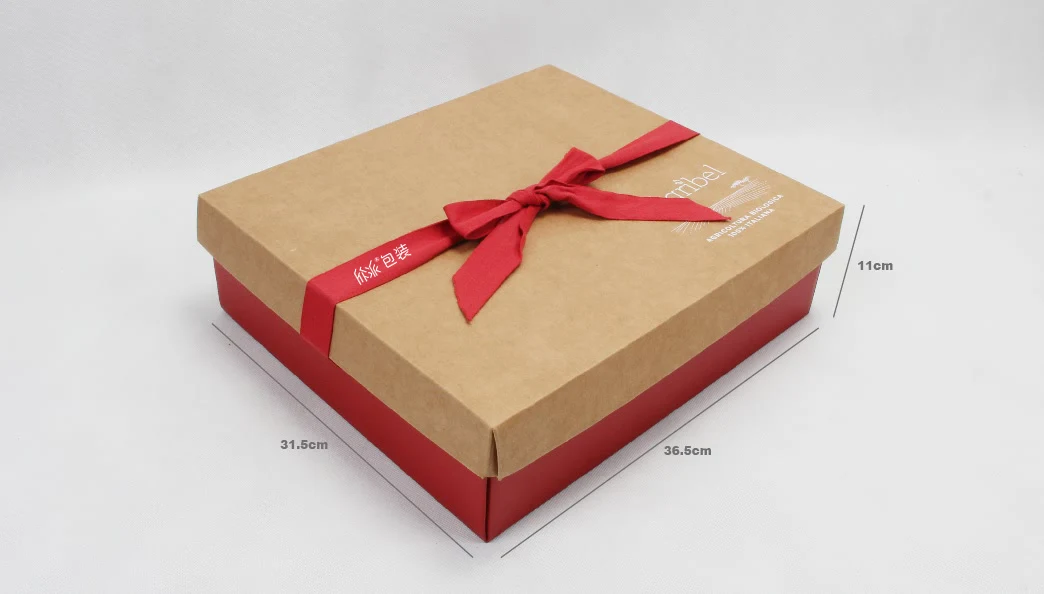 这款环保食品礼品包装盒采用瓦楞纸和铜版纸制成,牢固厚实,外覆亚膜,使包装盒看起来更有光泽,同时增加了纸盒的使用寿命。包装盒采用的是常见的天地盖结构,双色设计,盒盖与盒身形成鲜明的颜色对比,吸人眼球。