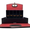 内部可以放置五瓶蓝莓酒,四合扣搭配棕色皮革固定酒瓶,和黑色酒瓶的颜色搭配非常好。在底部,镂空的酒瓶形状。可以看到里面的酒。拎手的硅胶材质,有效减少了勒力感。整体的档次非常高端。
