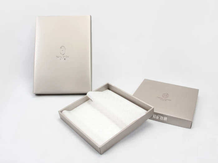 太湖雪位于美丽的太湖之滨,苏州震泽镇,是国内首屈一指的高档真丝家纺品牌。太湖雪丝巾盒共有两个尺寸,方便放置不同大小的丝巾。原料采用了经典的白卡纸,白卡纸质地坚硬,双面平滑,是制作各类纸盒的首选材料。