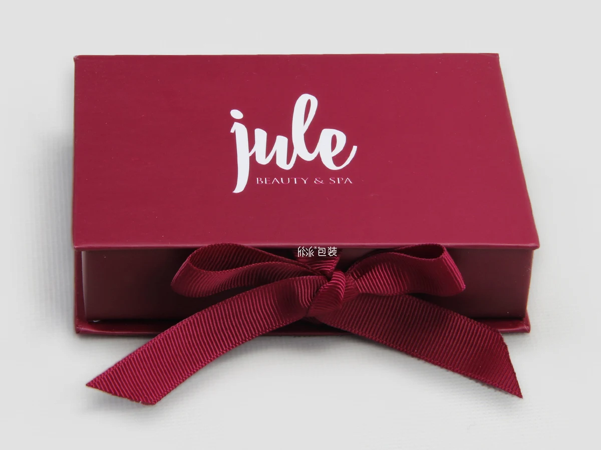 这款礼品盒是欣派包装为JuleBeautySpa机构制作的礼品卡盒,精选高档双铜纸,双面平滑,纸质细密,内里对角丝带,可以对卡有很好的固定作用。纸盒的封口方式也是采用丝带,比一般的磁铁更精巧别致。